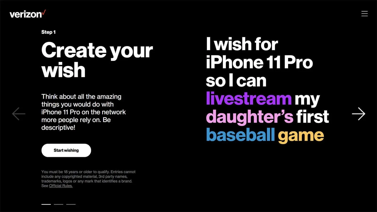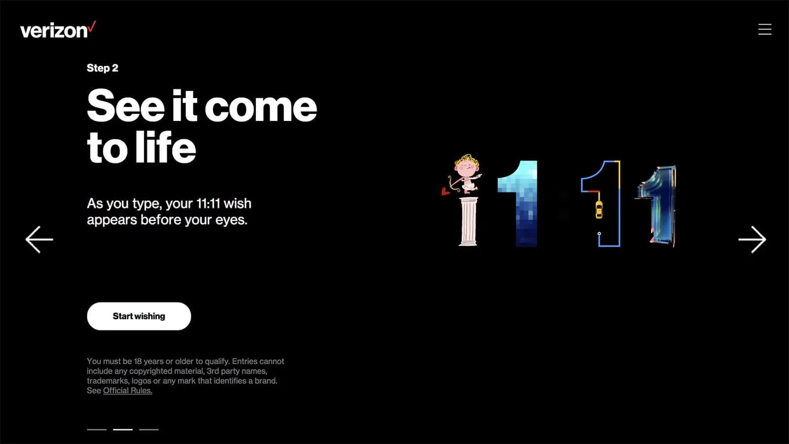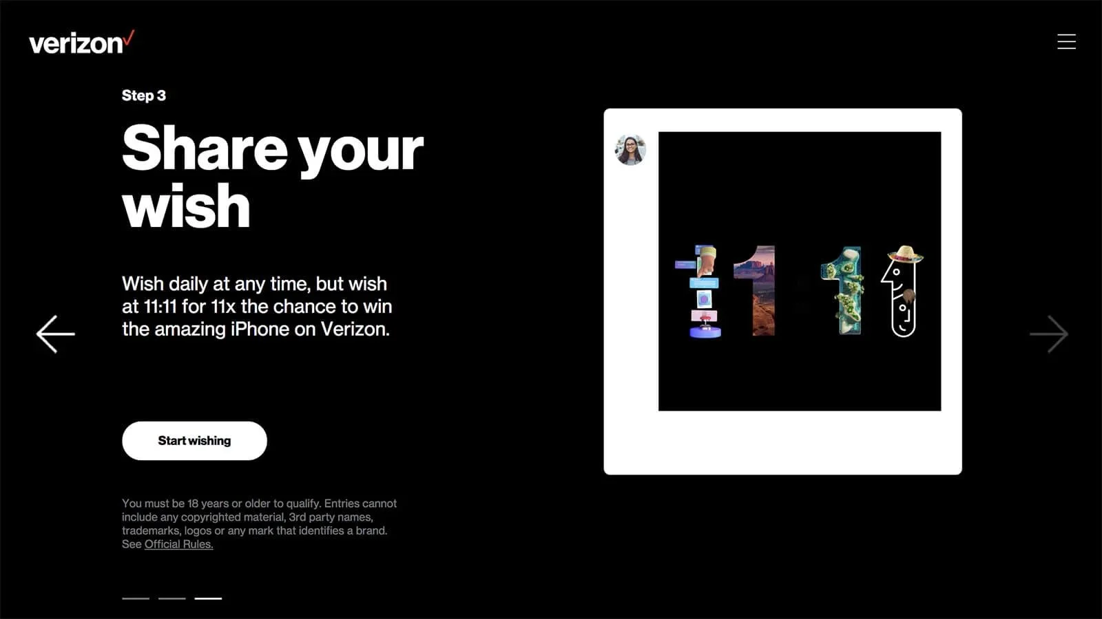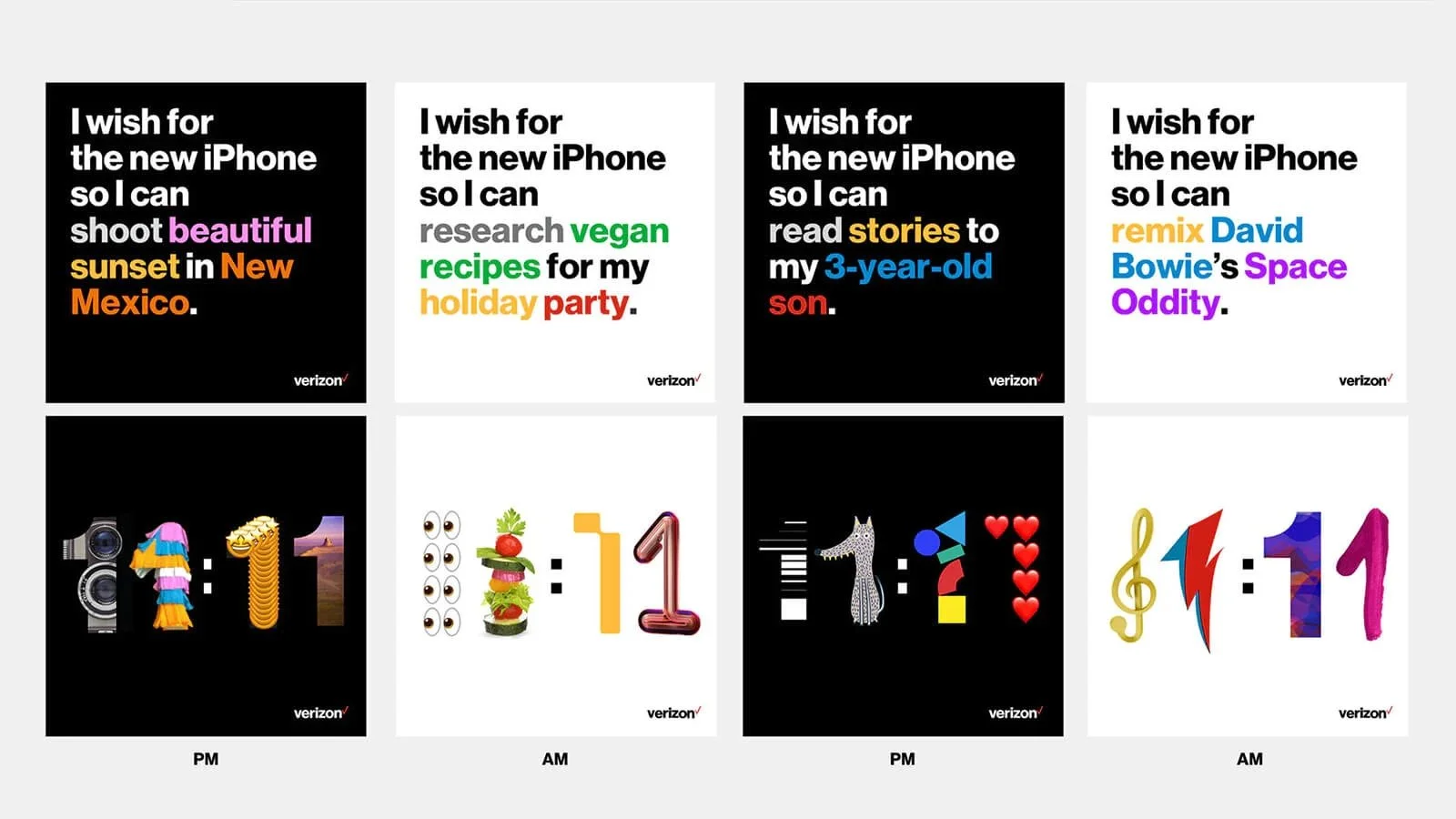 To drive social conversation around the launch of iPhone 11 on Verizon, we leaned into the most magical time of day - 11:11. Hijacking a moment dedicated to making wishes, we developed a real-time content generator that allowed people to share their wish for the new device with a custom 11:11 asset. We designed 1,000+ unique 1s, resulting in billions of possible wish combinations.